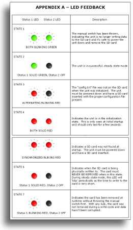 Due to the lack of a user interface (no web interface, no laptop to monitor the device's state), the two on-board LED's were designed into the application and used to provide distinct feedback depending on a handful of possible states (data writing, card absent, card ready for removal, etc). A summary of these states and the corresponding LED behavior can be found below.